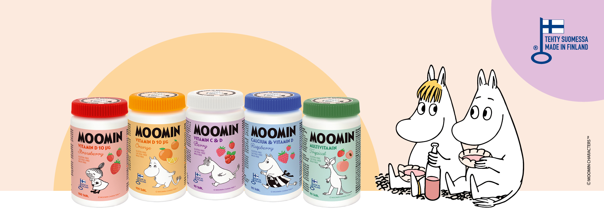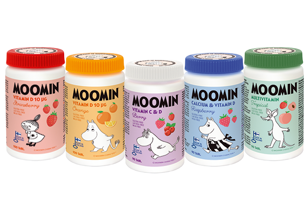 Moomin vitamiinisarjaan kuuluu viisi tuotetta, jotka sisältävät vastustuskykyä vahvistavaa D-vitamiinia* sekä muita tärkeitä vitamiineja ja kivennäisaineita: Moomin D-vitamiini purutabletit Appelsiini ja Mansikka sisältävät suositeltavan päiväannoksen D-vitamiinia. Moomin Berry sisältää D-vitamiinin lisäksi myös C-vitamiinia*. Moomin Pehmo Monivitamiini puolestaan on pehmeä pureskella ja se sisältää C- ja D-vitamiineja sekä muun muassa useita B-sarjan vitamiineja ja sinkkiä*.