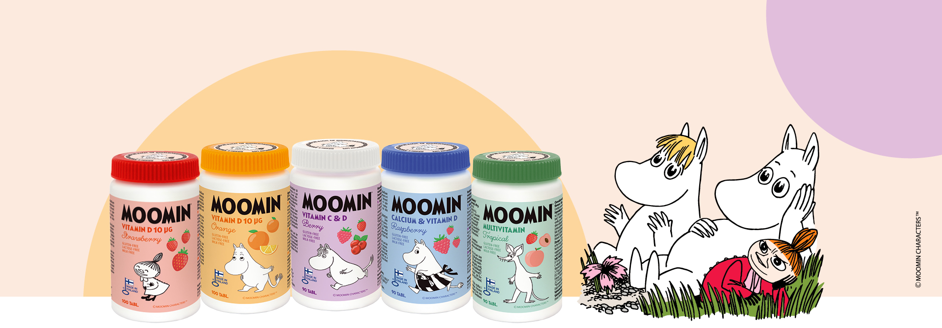 Till Moomin-vitaminer hör Moomin D-vitamin Strawberry, Moomin D-vitamin Orange, Moomin C&D-vitamin Berry, Moomin Multivitamin Tropical samt Moomin Kalcium & D-vitamin Raspberry. Dessa vitaminer är utvecklade för barn över 3 år och vuxna. Tabletterna är lätta att ta, antingen genom att tuggas eller låtas smälta i munnen, och lämpar sig för dagligt bruk.