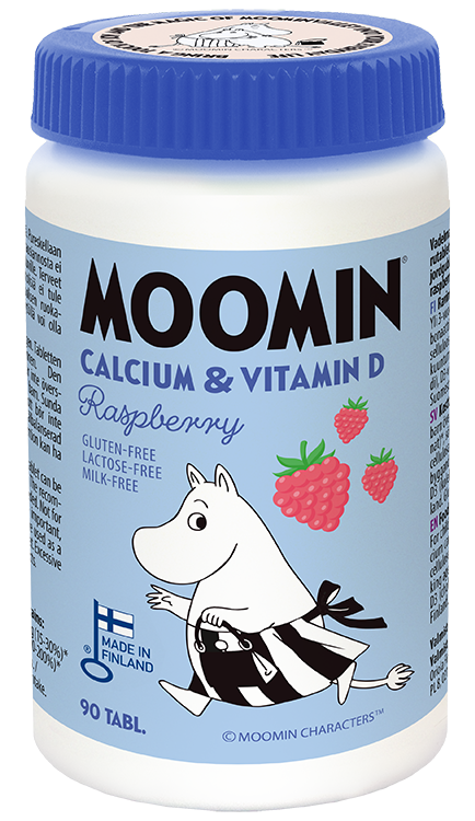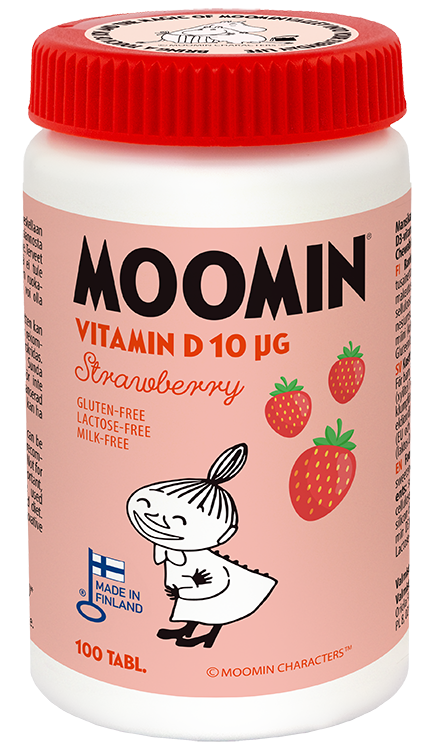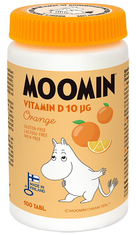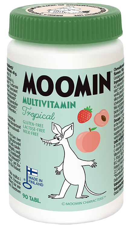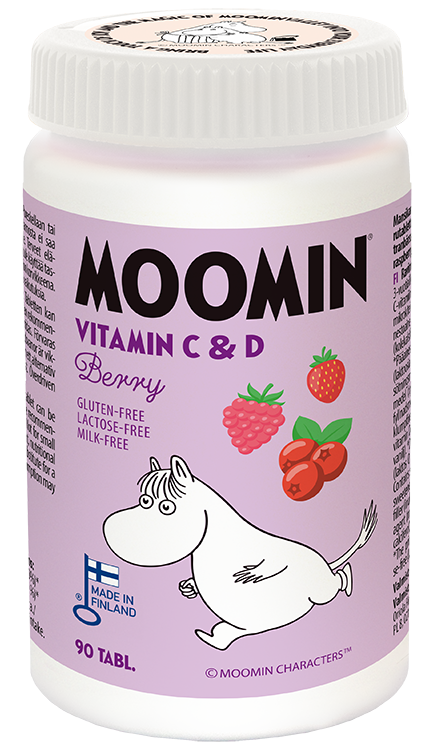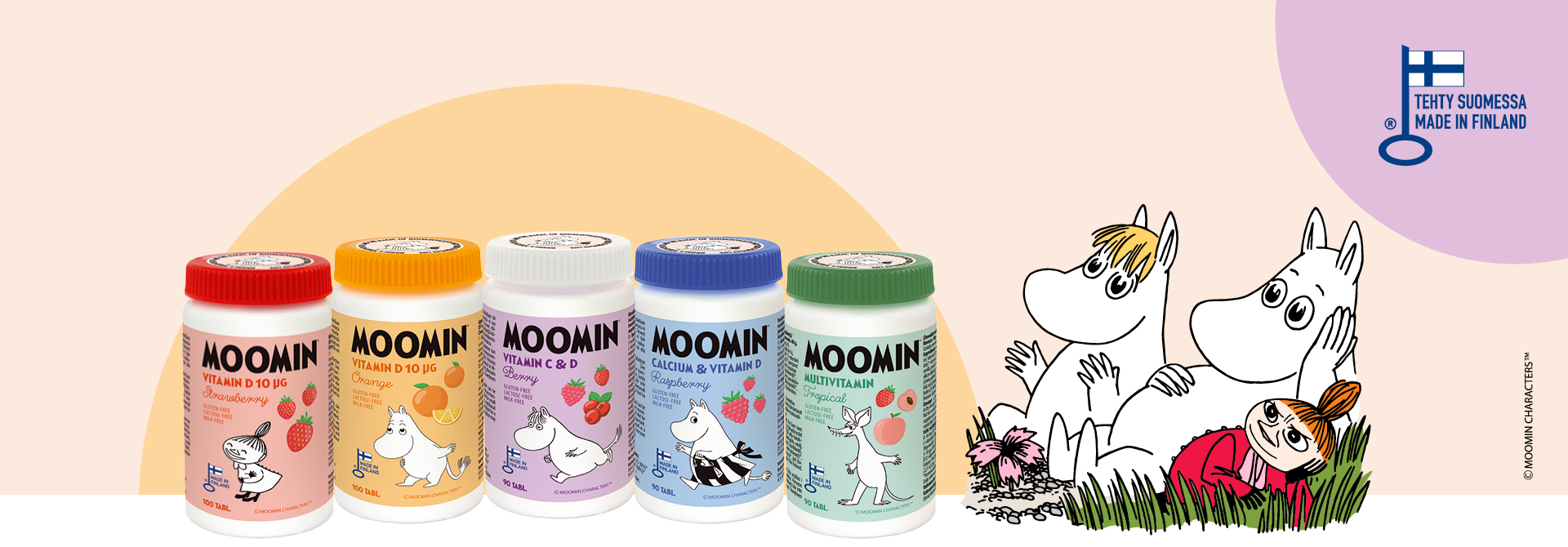Moomin vitamiinituotteisiin kuuluvat Moomin D-vitamiini Strawberry, Moomin D-vitamiini Orange, Moomin C&D-vitamiini Berry, Moomin Monivitamiini Tropical ja Moomin Kalsium & D-vitamiini Raspberry sekä Moomin Pehmo Monivitamiini. Nämä yli 3-vuotiaille lapsille ja nuorille suunnitellut vitamiinit ovat helposti pureskeltavia tai imeskeltäviä ja ne sopivat päivittäiseen käyttöön.